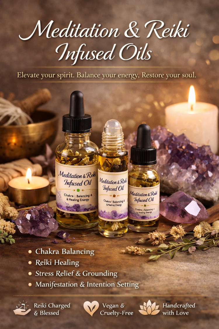 Elevate your spiritual practice with our handcrafted Meditation & Reiki Infused Oils, created to calm the mind, open the heart, and align your energy. Each blend is intentionally formulated with high-quality essential oils, botanicals, and Reiki-charged energy to support deep relaxation, chakra balancing, and spiritual clarity.