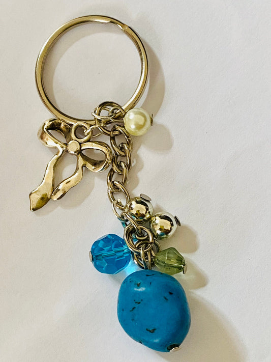 Turquoise Stones, Blue Beads with Bow Multi Charm Keyring, Hand Bag Charm, Gift For her, Birthday, Cute Gift.