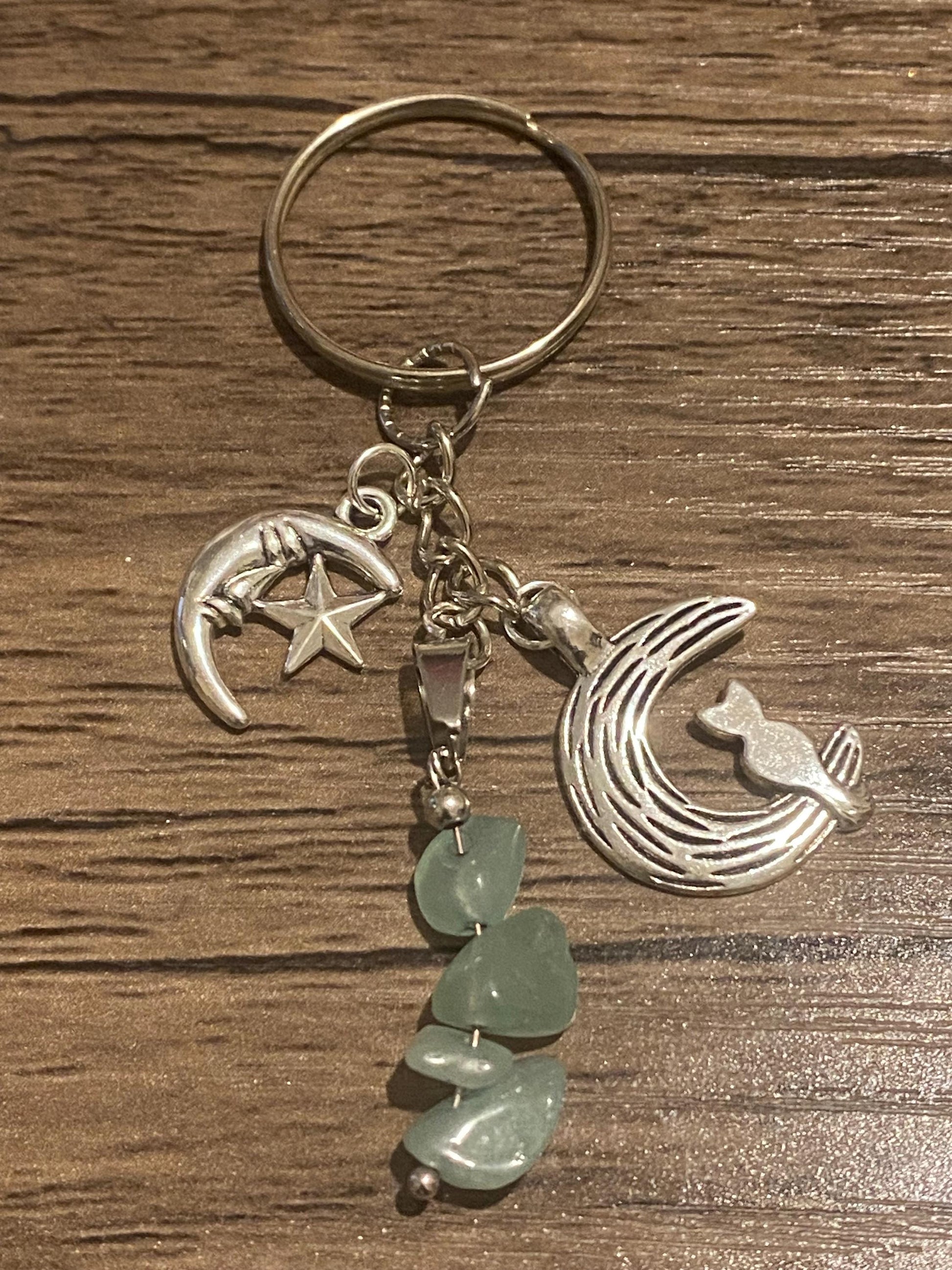 Aqua Moon & Cat Charm Keychain | Silver Crescent Star Design | Healing Crystal Keyring | Celestial Gift for Her | Spiritual Boho Gift