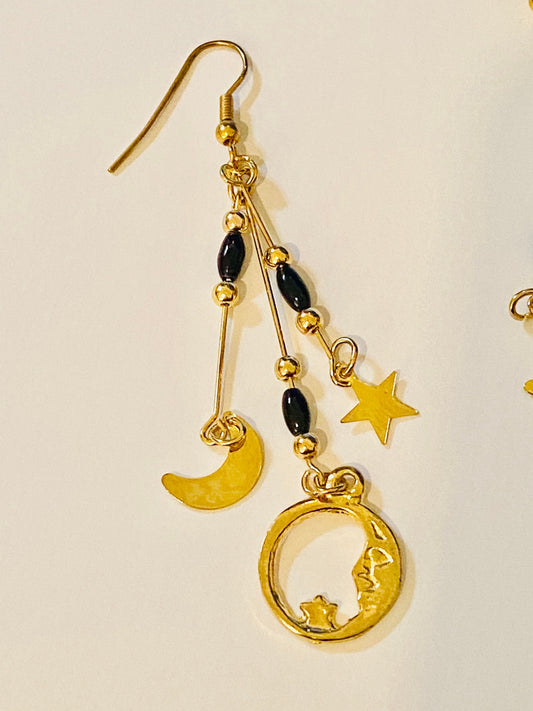 Woman, Girls Star, Sun and Moon Gold Tone Dangle Earrings with Black Beads.