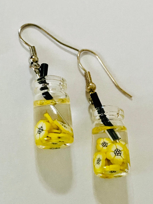 Woman, Girls Yellow Flowers Mason Glass Charm Beaded Fashion, Boho Dangle Earrings. Hook Drop, Pierced Ears.