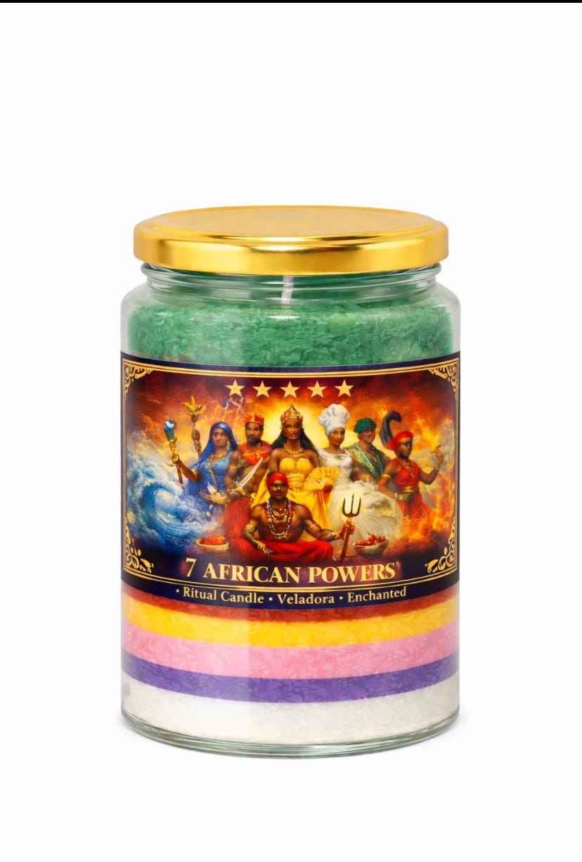 Invoke the combined strength of the 7 African Powers with this powerful, hand-prepared ritual candle, designed for altar work, prayer, manifestation, and spiritual protection.