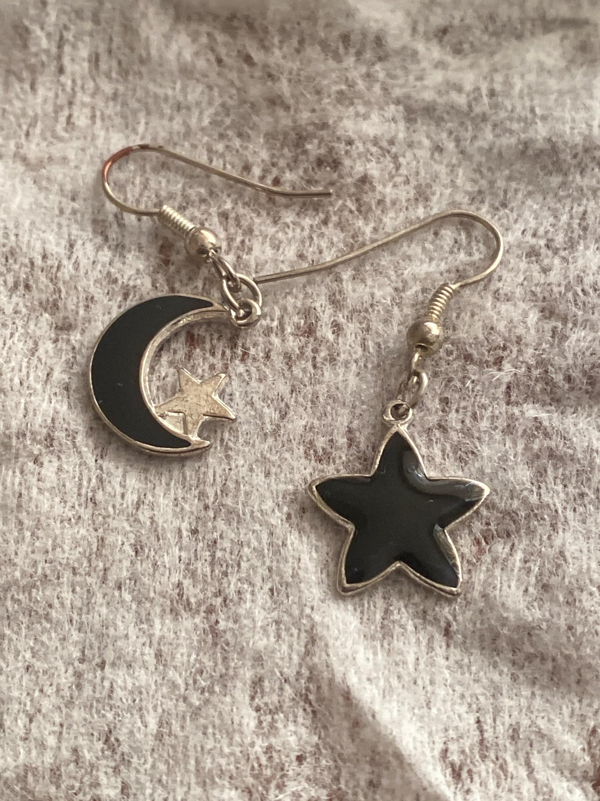 Celestial Moon & Star Mismatched Earrings, Black Enamel Witchy Earrings, Boho Cosmic Jewellery, Gift for Her