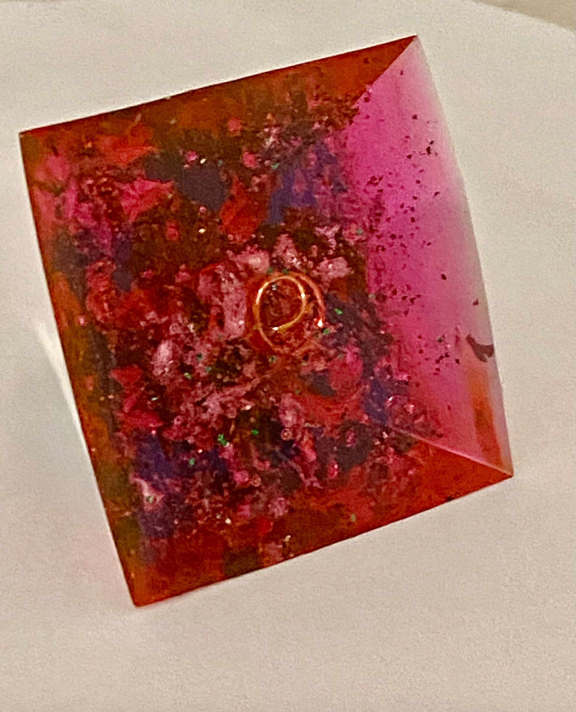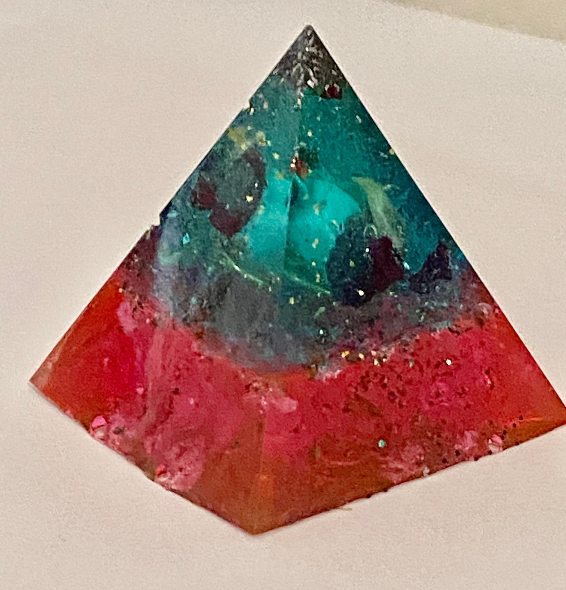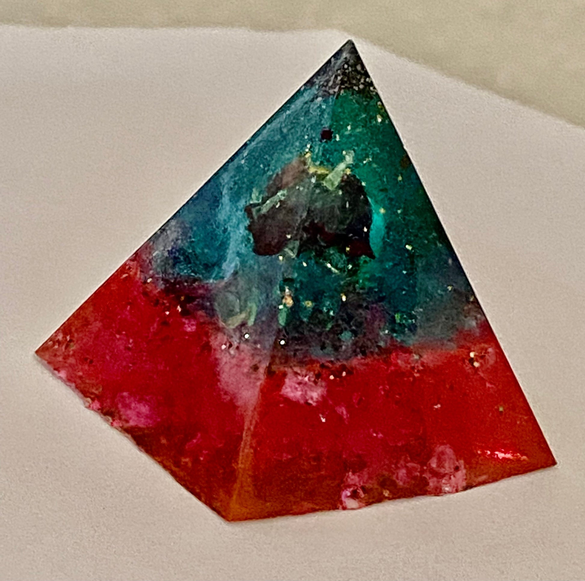 This Pyramid is made with Resin, Lodestone, Shungite, Crystals, Fairy Dust, Gem Stones, Charms, Glitter, Copper, Flower Petals.