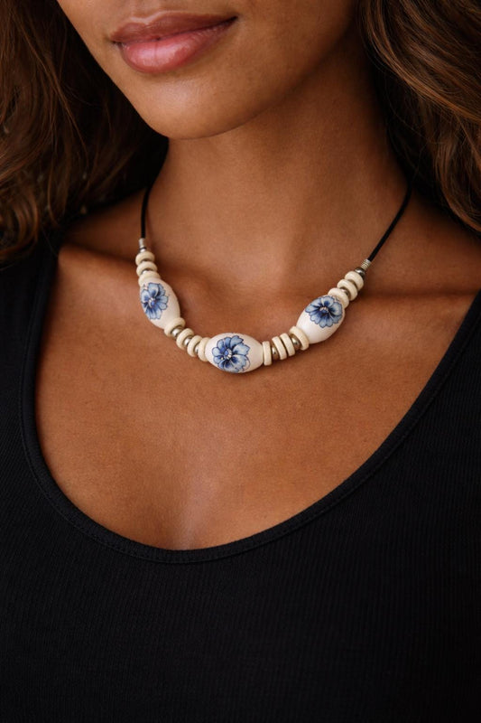 Blue & White Ceramic Bead Choker Necklace | Boho Floral Necklace | Cottagecore Jewellery | Vintage Style Beaded Necklace | Gift for Her