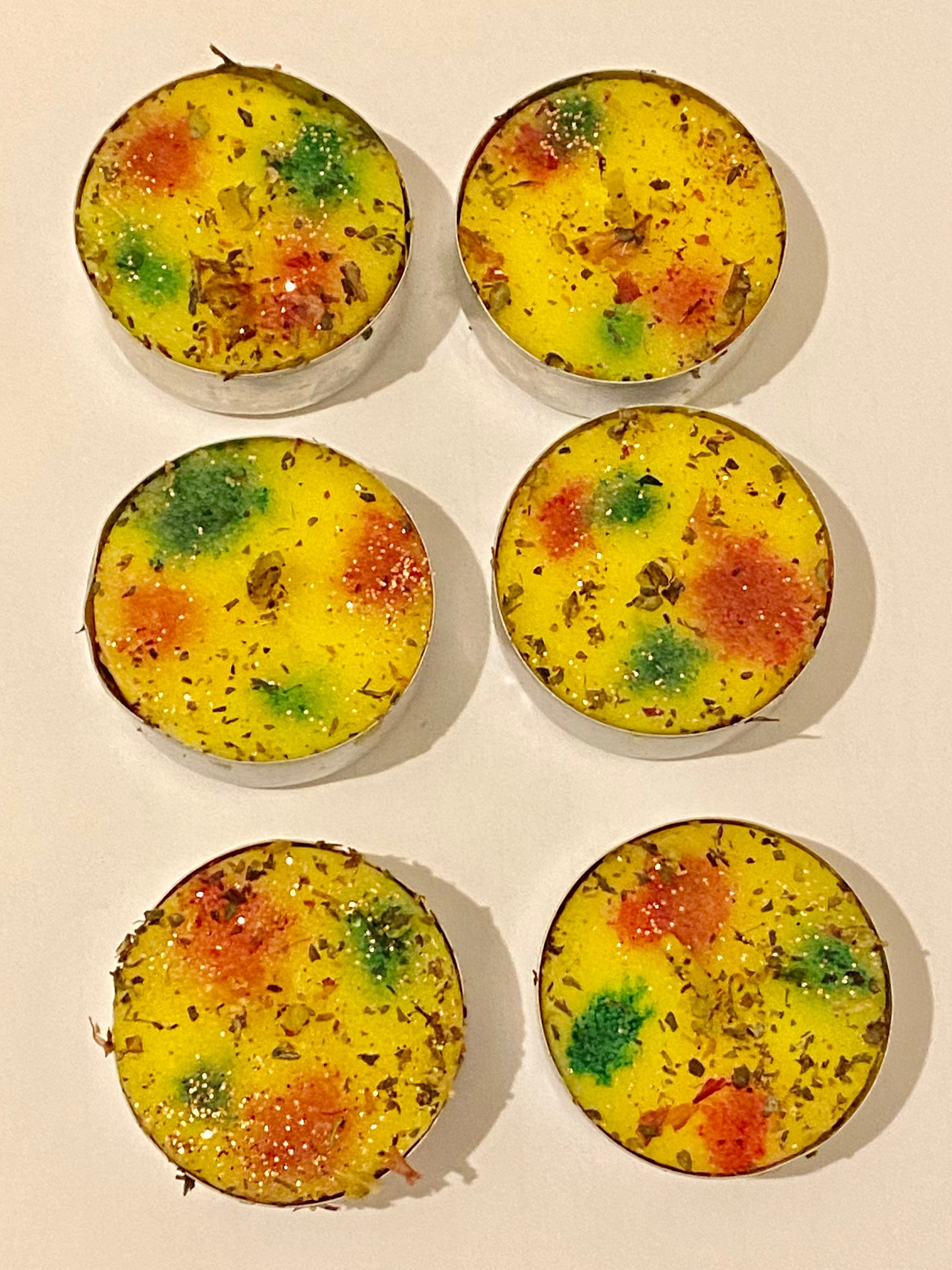6 Pretty Lemon scented Happiness and Joy Tea light Candles, made with herbs, oils & powders. Handmade Blend - Use to draw happiness. 🍋
