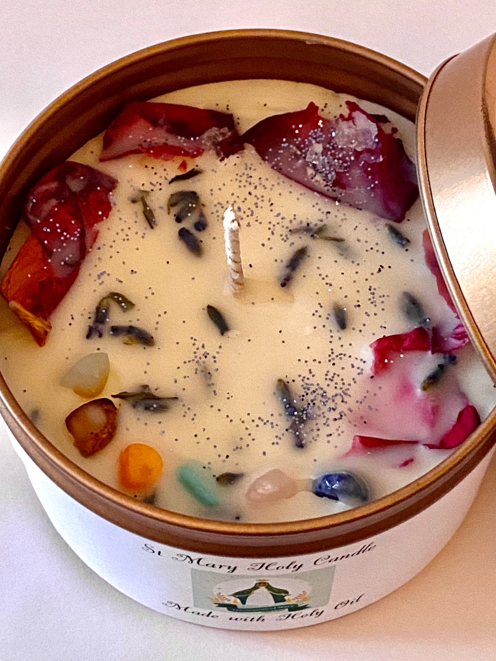 St Mary Holy Scented Luxury Tin Candle infused herbs flowers and Crystals. 8oz - Scented.