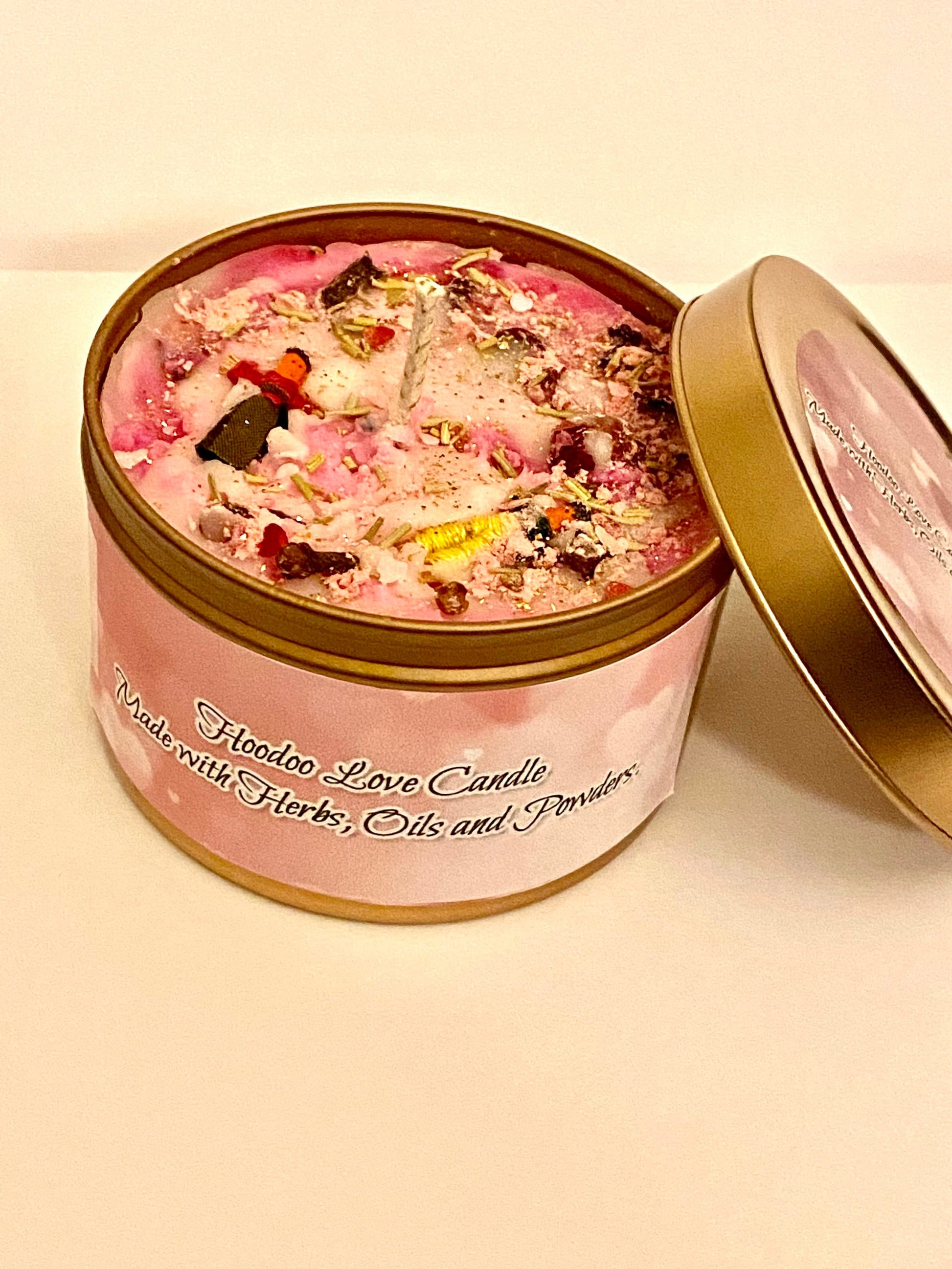 Made with soy wax, love oil, herbs, powders and essential oils.